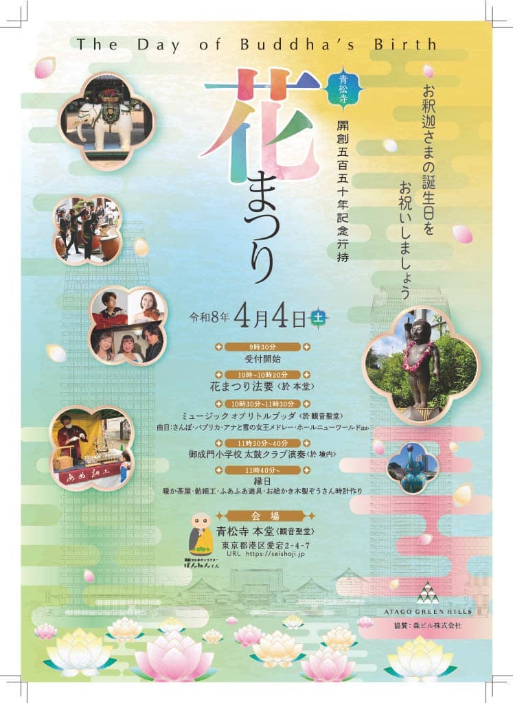 4月8日はお釈迦様のお誕生日です。このお祝いに合わせ4月4日に「花まつり」を開催します。花まつりの法要、コンサート公演や、境内での縁日など、お子様とも賑やかに楽しめる集いです。ぜひご参集ください。