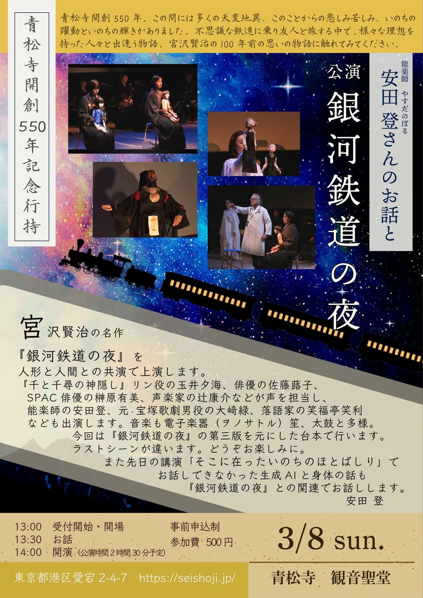 青松寺開創550年。この間には多くの天変地異、このことからの悲しみ苦しみ、いのちの躍動といのちの輝きがありました。不思議な鉄道に乗り友人と旅する中で、様々な理想を 持った人々と出逢う物語。宮沢賢治の100年前の思いの物語に触れてみてださい。